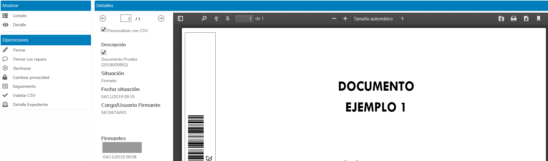 Una vez visualizado, tenemos la posibilidad, desde esta misma pantalla, de ejecutar acciones sobre el documento, como Firmar, Rechazar o Cambiar su privacidad.