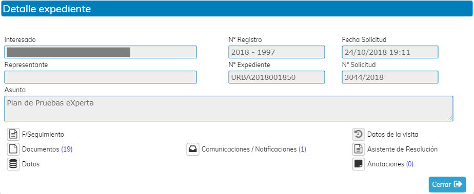 En la imagen superior observamos que está habilitado un icono llamado "Detalle Expediente". Esta opción se habilita siempre que el documento esté vinculado a un expediente, y nos haya llegado a través del gestor de tareas o el monitor de solicitudes.