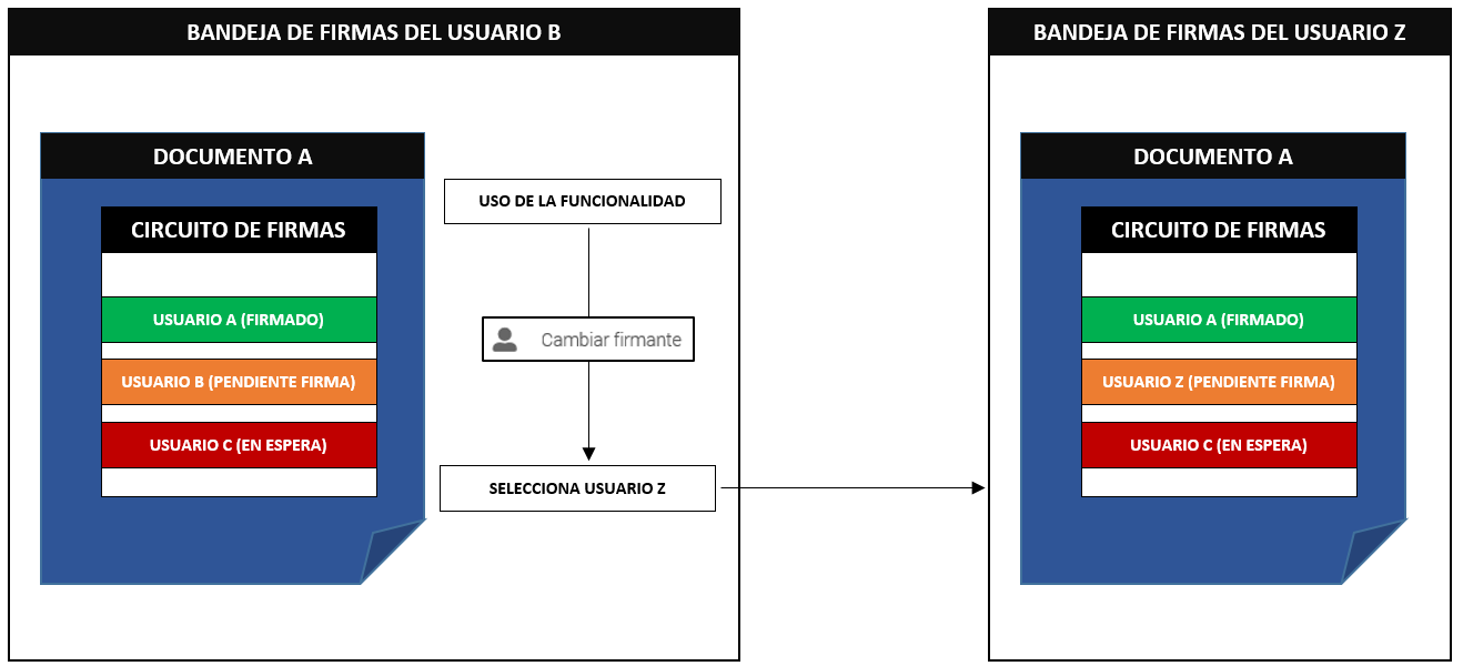 Mediante esta opción, un usuario podrá reemplazarse a sí mismo como firmante, estableciendo un nuevo firmante que lo remplazará en el circuito de firmas.