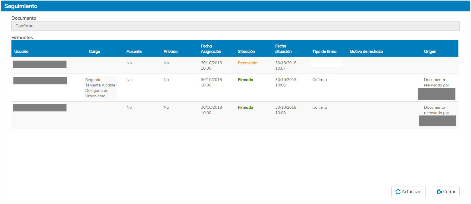 En el seguimiento del documento, veremos un histórico del documento donde consultar datos referentes a cada uno de los firmantes, como pueden ser la situación, fecha de firma, tipo de firma, etc.