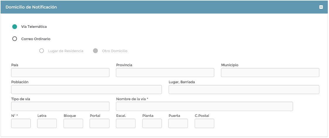 Otro domicilio. En caso de que queramos recibir las notificaciones en un domicilio distinto al lugar de residencia, marcamos la opción correspondiente e introducimos los datos en el formulario en blanco.