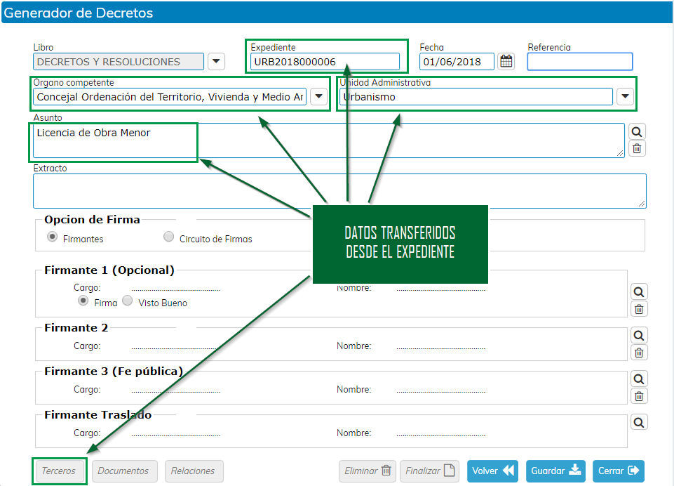 Gracias a esta vinculación podemos generar, desde el generador de decretos y resoluciones, notificaciones, para cada uno de los terceros incluidos en los expedientes secundarios.