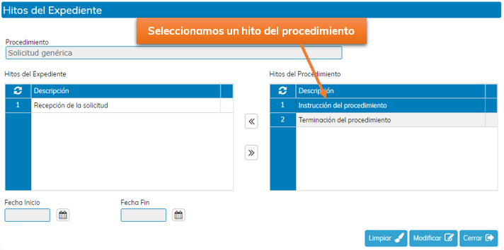 Podemos desasignar un hito del expediente y devolverlo a la rejilla de hitos del procedimiento.